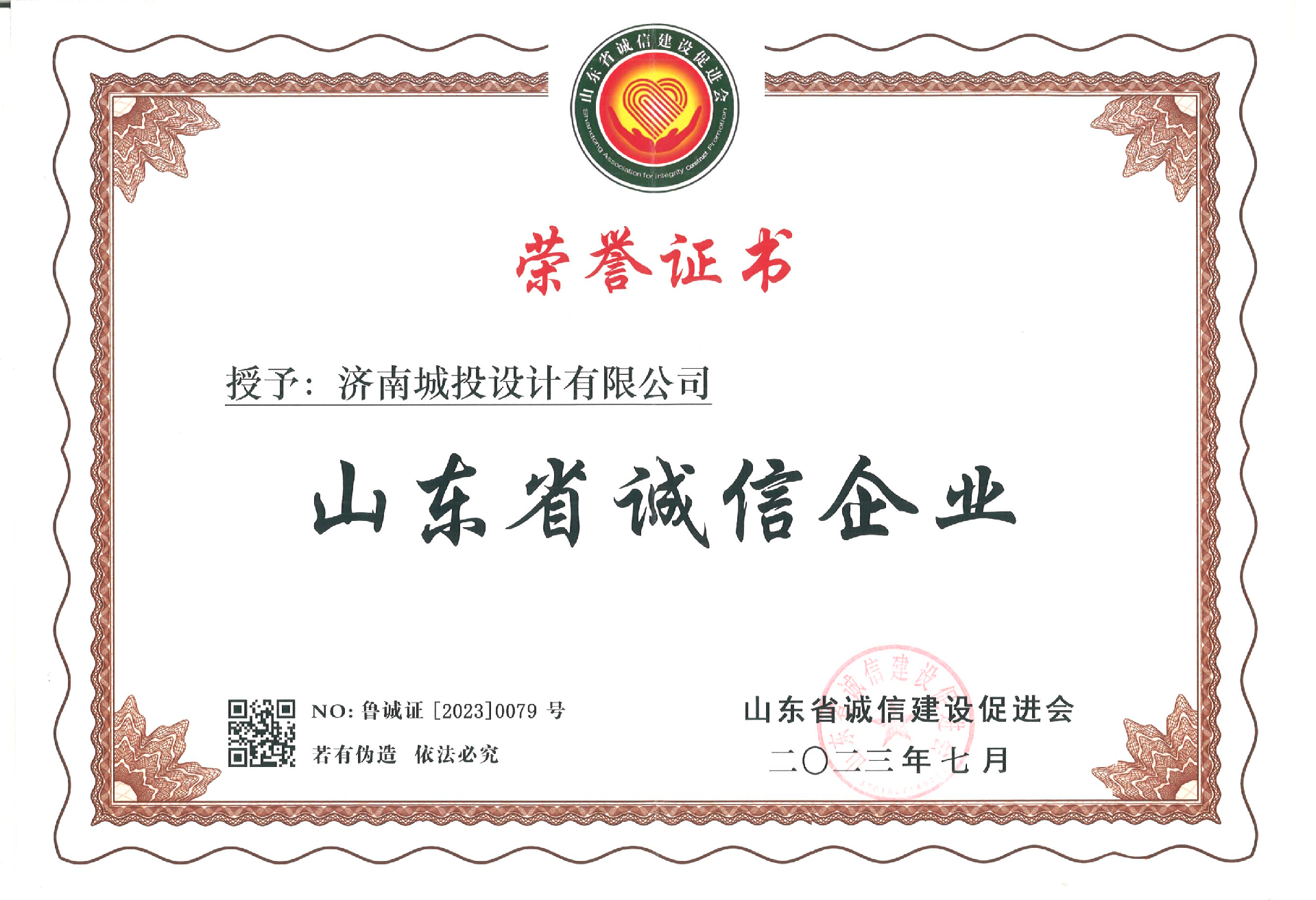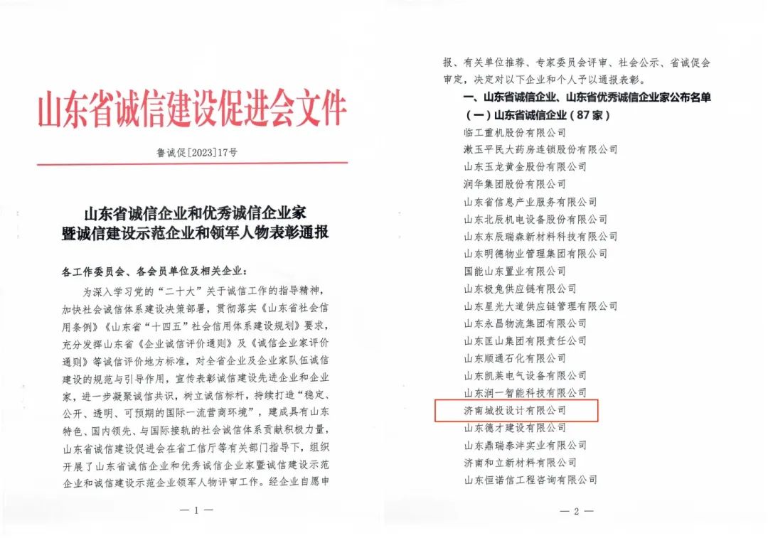 多年來(lái),濟(jì)南城投設(shè)計(jì)有限公司以“為生態(tài)更文明,讓生活更美好”為企業(yè)使命,積極踐行“知行合一,為人民服務(wù)”的企業(yè)核心價(jià)值觀……將誠(chéng)信品質(zhì)深深融入到公司的企業(yè)文化和生產(chǎn)經(jīng)營(yíng)中,塑造了良好的企業(yè)形象,樹立了良好的社會(huì)聲譽(yù)。